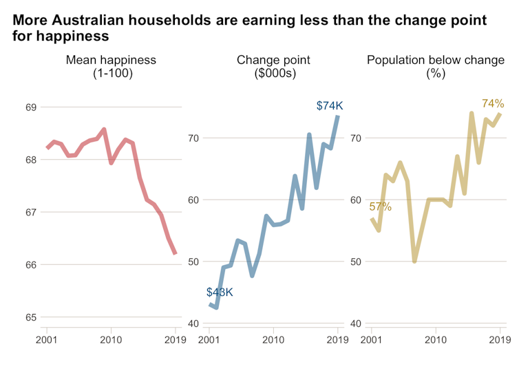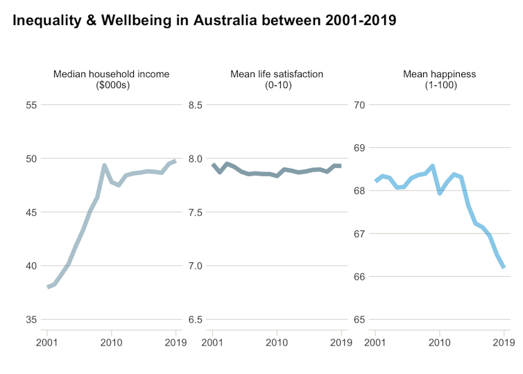 Our work shows someone living in the average Australian household earning A$50,000 in 2001 and the equivalent amount in 2019 (adjusted for inflation) has become much less happy over the past two decades.