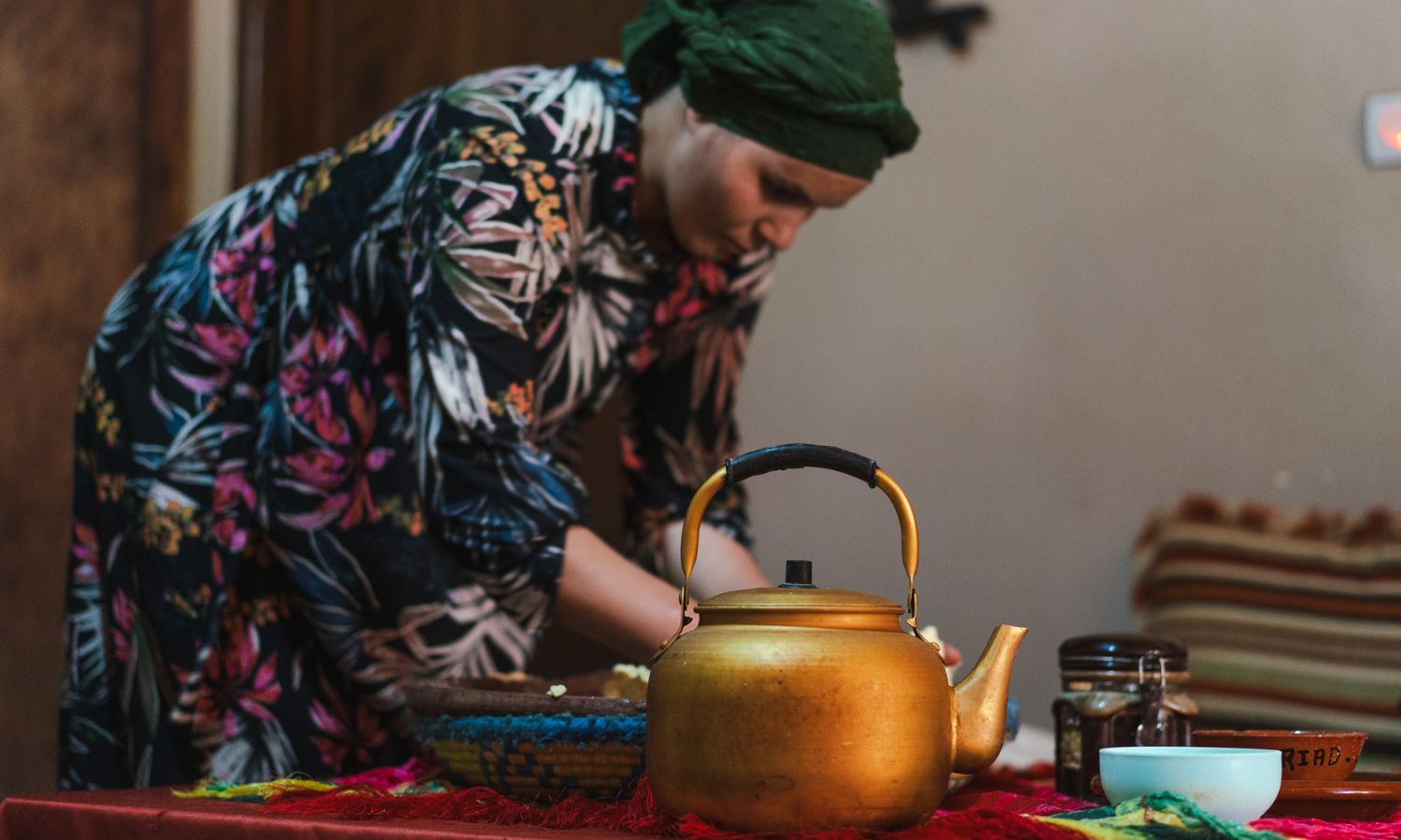 We finally reach the summit, where Aroumd is perched on a rocky outcrop. Brahim guides us to a home with one of the most breathtaking views in the world, overlooking the valley from a living room positioned 1,900 meters above sea level. We were greeted with milk and dates, which Malika’s husband encouraged us to drink from the bowl. “It’s a tradition,” he explains. Next to the table with the milk and dates was his brother, Hajin, a master tea maker. He skillfully pours fresh mint tea from above his head into a shotglass-like vessel below his knee and offers it to us as we take our seats.